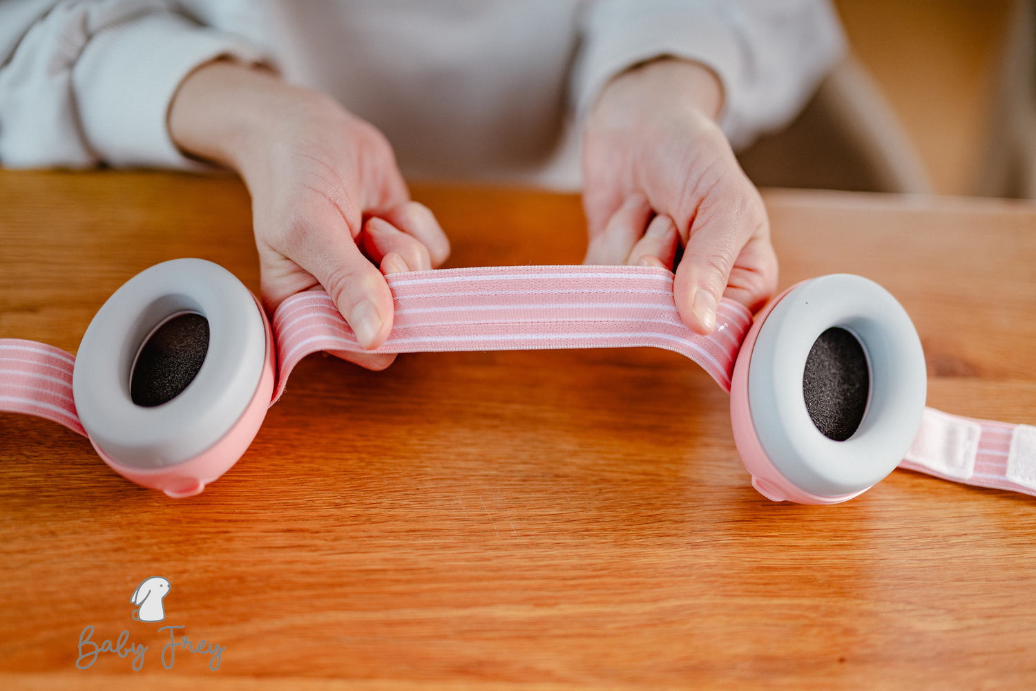 Das weiche Kopfband passt sich jeder Kopfform an, bleibt sicher an Ort und Stelle und sorgt für spürbare Entlastung für Eltern und Kind.
